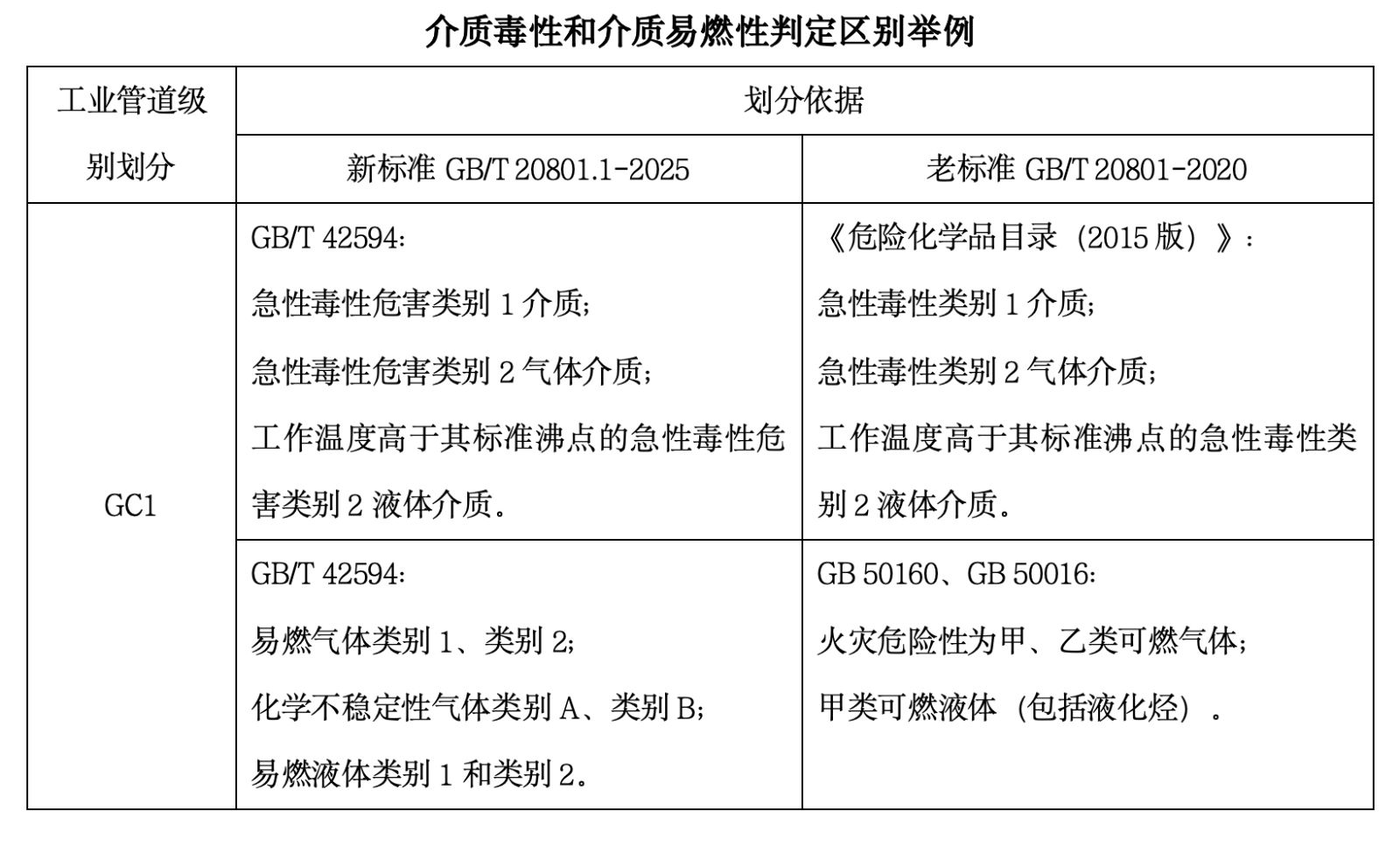 GB/T 20801.1-2025明确要求,工业管道分级不再以《危险化学品目录(2015版)》作为介质毒性判定依据,不再以《石油化工企业设计防火规范(2018年版)》(GB 50160-2008)和《建筑设计防火规范(2018年版)》(GB 50016-2014)作为介质易燃性判定依据,而以《承压设备介质危害分类导则》(GB/T 42594-2023)作为统一的判定标准。